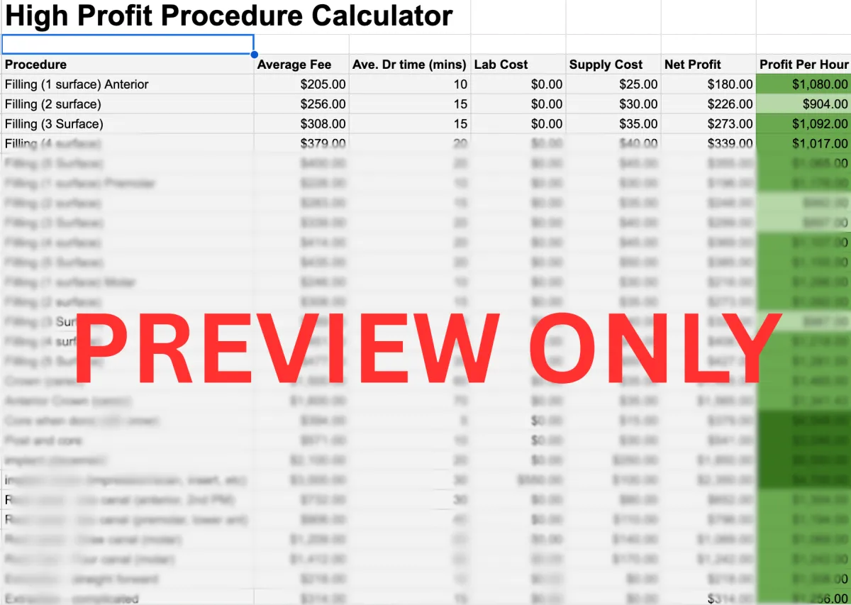A simple but powerful spreadsheet that shows you exactly how profitable each procedure is — so you can prioritize your schedule for maximum profitability.